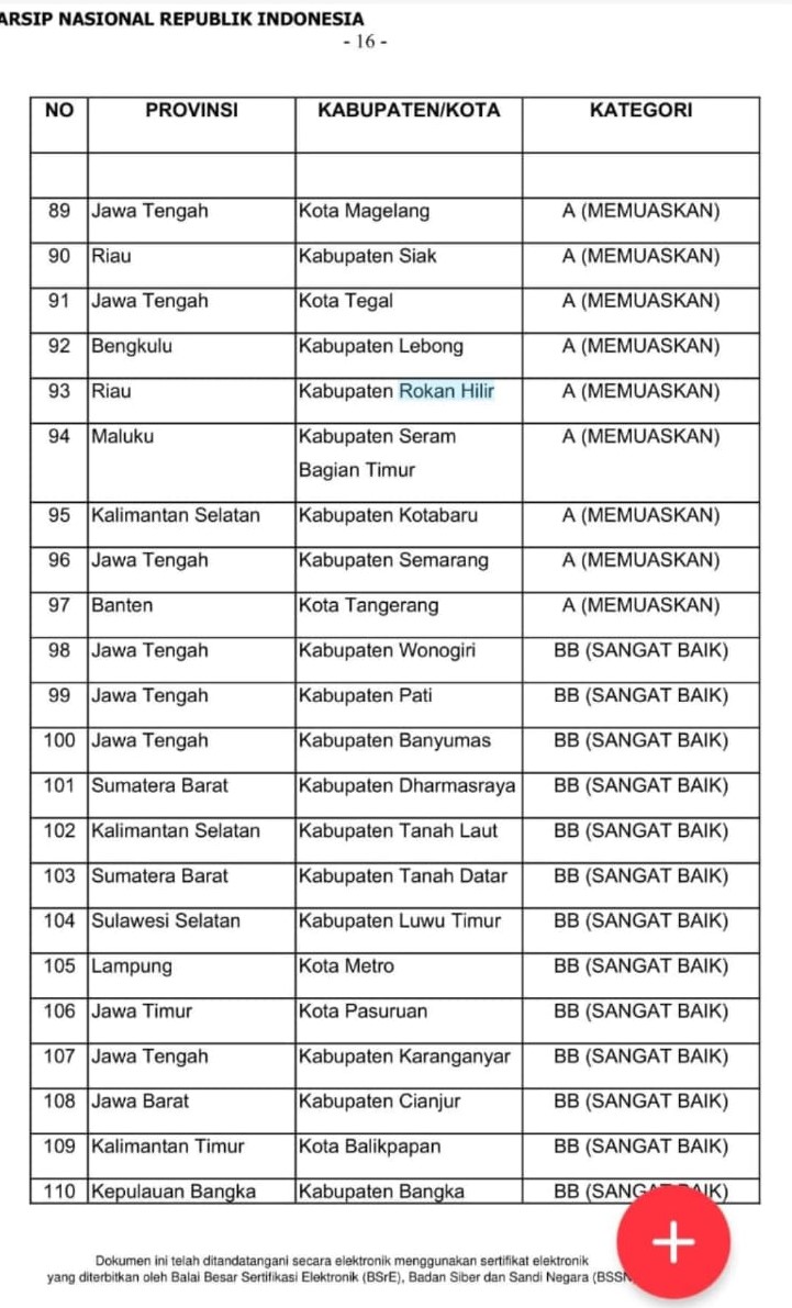 Diskominfotiks Rohil – Pemerintah Kabupaten Rokan Hilir mencatatkan prestasi di bidang kearsipan dengan menempati peringkat ke-93 nasional dan peringkat ketiga Provinsi Riau dalam Hasil Pengawasan Kearsipan Tahun 2025, berdasarkan pengumuman resmi Arsip Nasional Republik Indonesia (ANRI), dengan predikat Nilai A dari total 508 kabupaten/kota se-Indonesia.