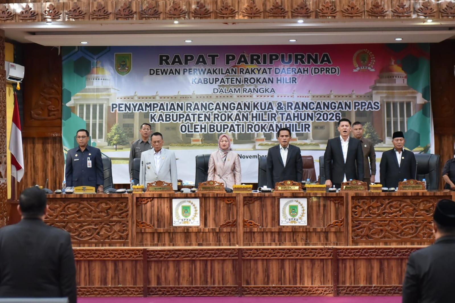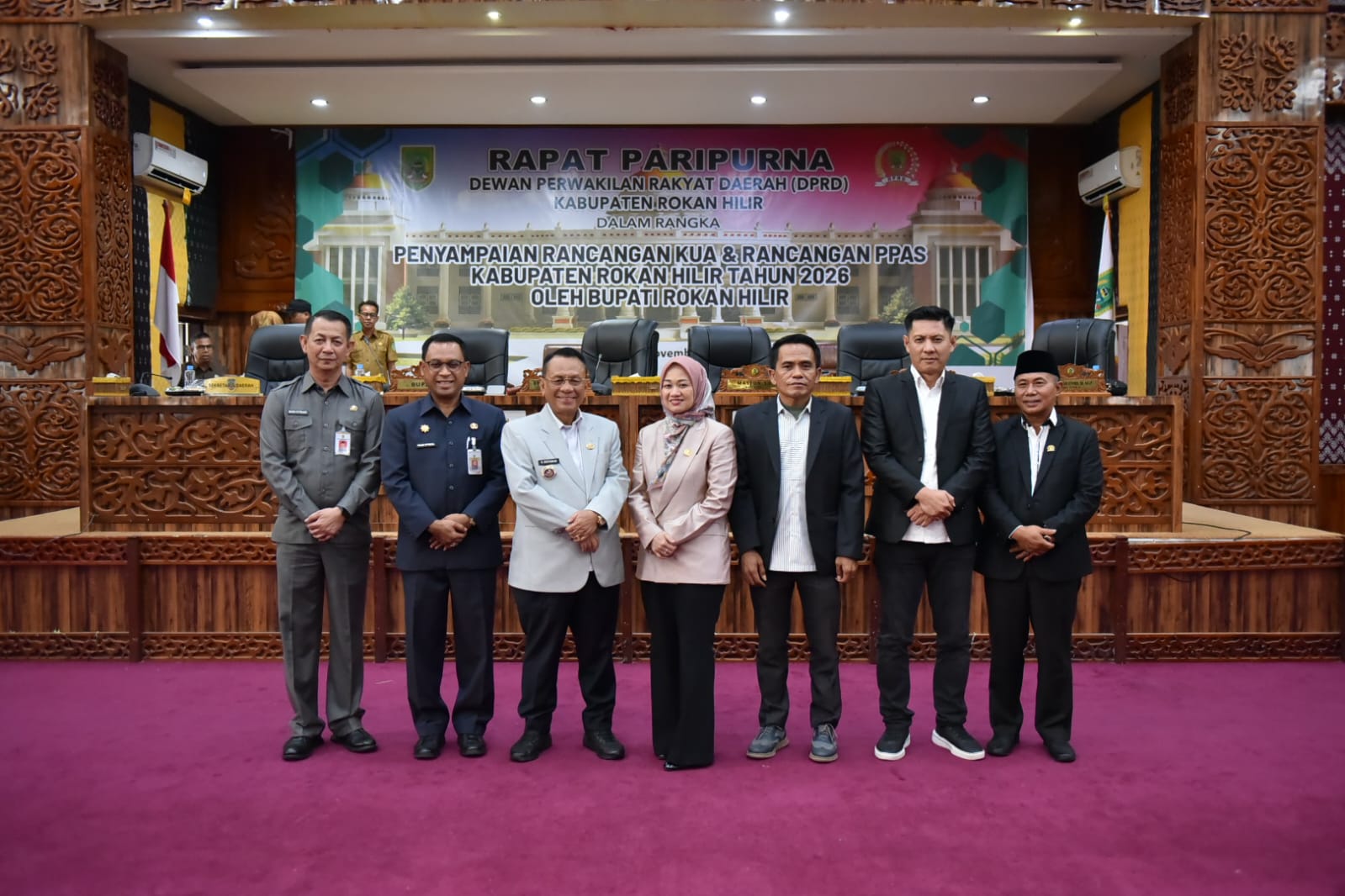 Diskominfotiks Rohil -- Bupati Rokan Hilir (Rohil), H. Bistamam sampaikan Rancangan Kebijakan Umum Anggaran dan Prioritas Plafon Anggaran Sementara (KUA-PPAS) Kabupaten Rokan Hilir Tahun 2026 pada rapat Paripurna Dewan Perwakilan Rakyat Daerah (DPRD) pada hari Selasa (25/11/2025) sore di ruang sidang utama Kantor DPRD Jalan Lintas Pesisir Batu Enam Bagansiapiapi, Rohil, Provinsi Riau.