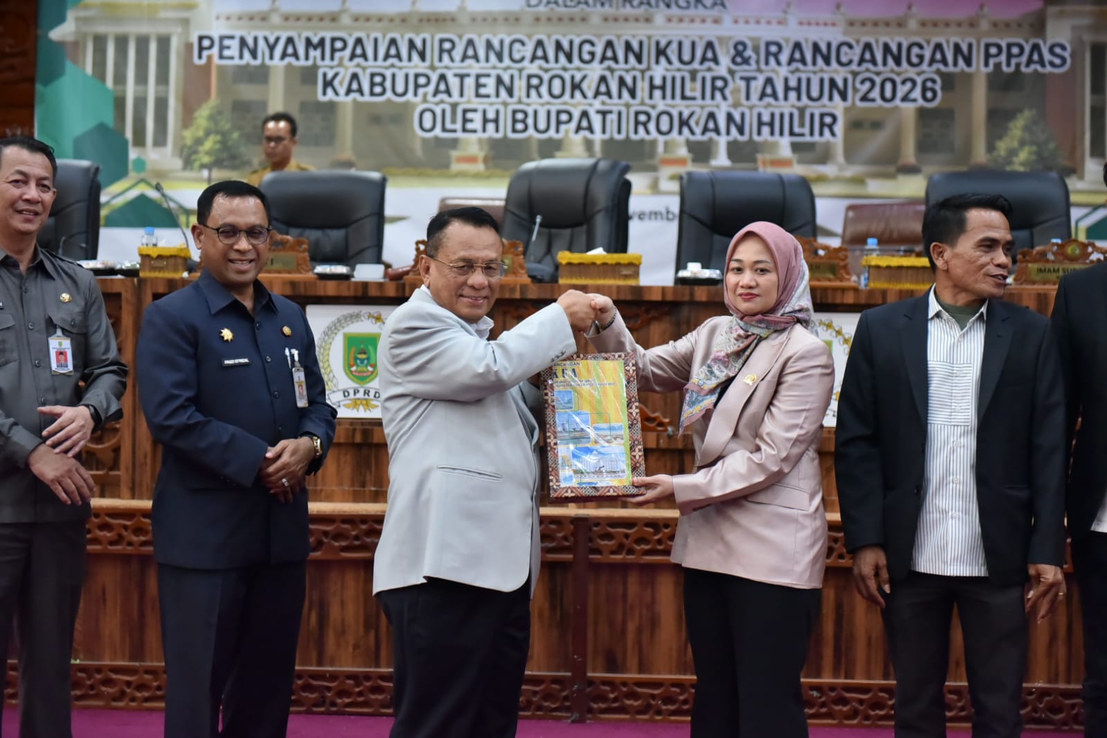Setelah selesai di sampaikan, Bupati Rohil H.Bistamam menyerahkan Rancangan KUA-PPAS Kabupaten Rokan Hilir tahun 2026 kepada Ketua DPRD Rohil Ilhami di saksikan para Wakil Ketua di DPRD, Sekda, Sekwan dan anggota DPRD Rohil yang hadir.