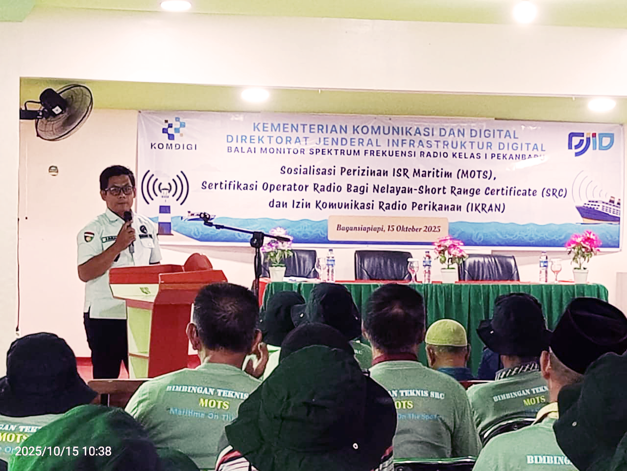 Diskominfotik Rohil - Kementerian Komunikasi dan Digital melalui Balai Monitor Spektrum Frekuensi Radio (SFR) Kelas I Pekanbaru mewajibkan nelayan di Kabupaten Rokan Hilir memiliki izin penggunaan radio komunikasi laut atau Izin Komunikasi Radio Perikanan (IKRAN). Kewajiban ini disosialisasikan pada Rabu (15/10/2025) di Bagansiapiapi Kabupaten Rokan Hilir, Riau sebagai upaya pemerintah mencegah gangguan frekuensi dan meningkatkan keselamatan pelayaran di wilayah pesisir Riau.